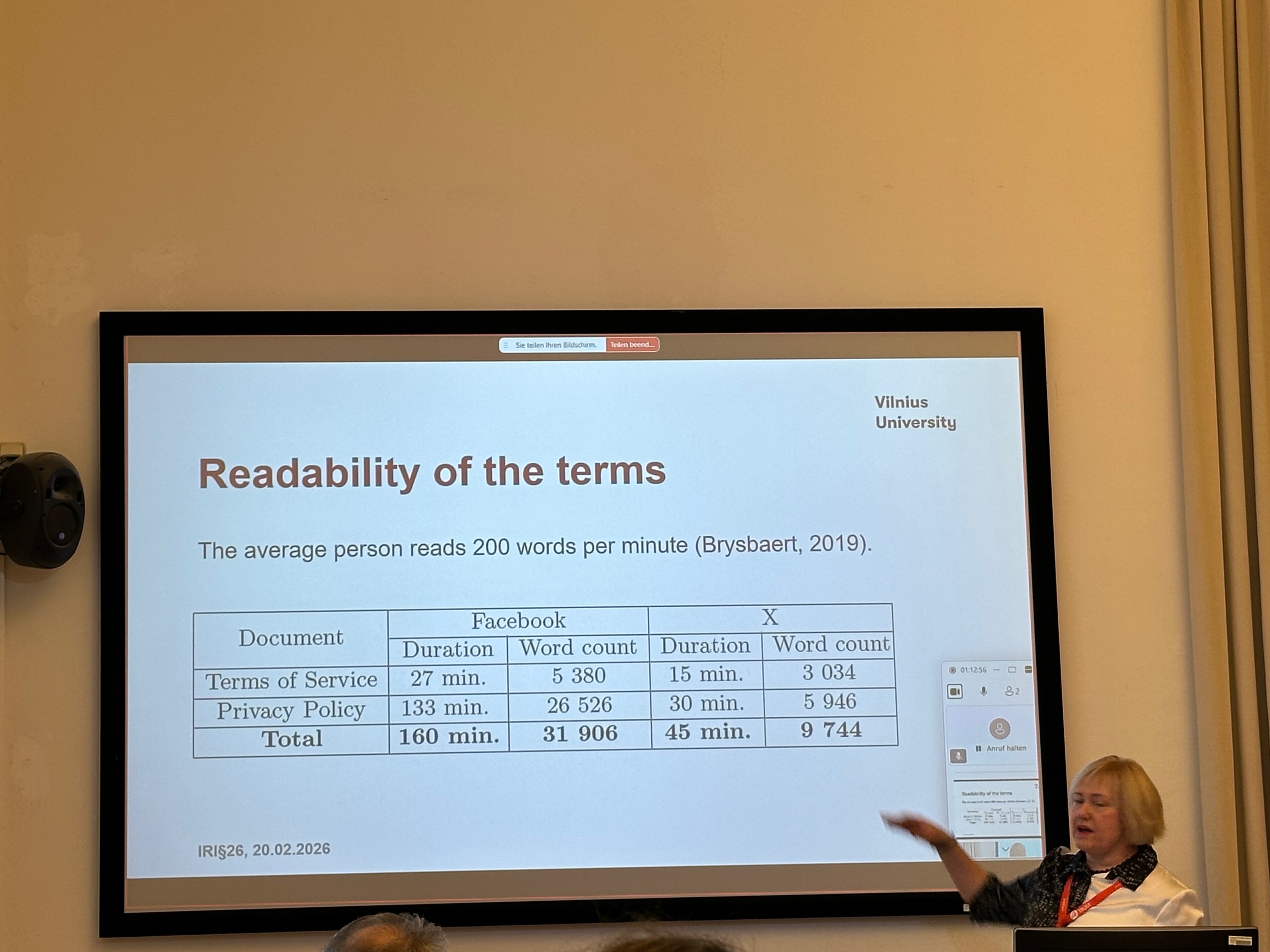 Dass dieses Problem kein Microsoft-Spezifikum ist, zeigte Kristina Lapin (Vilnius University) eindrücklich: Wer die AGB und Datenschutzerklärungen von Facebook vollständig liest, braucht dafür 160 Minuten – bei X sind es immerhin noch 45. Obscuratio per verbositatem ist Branchenstandard.